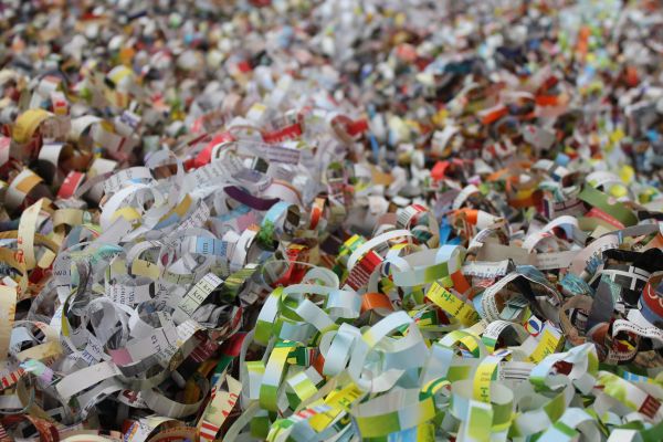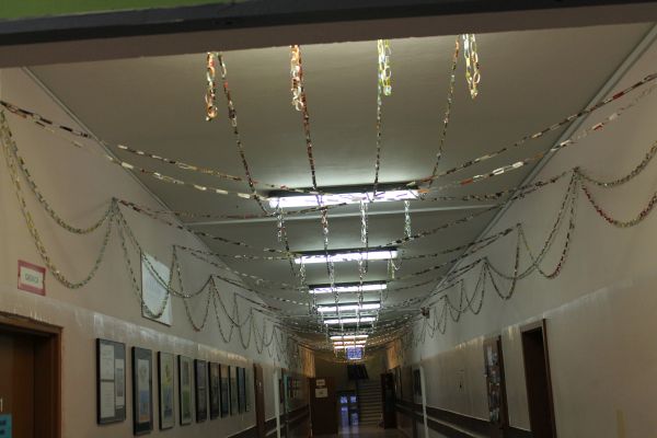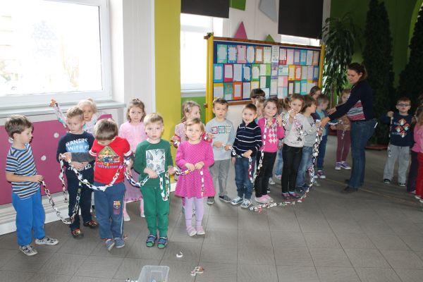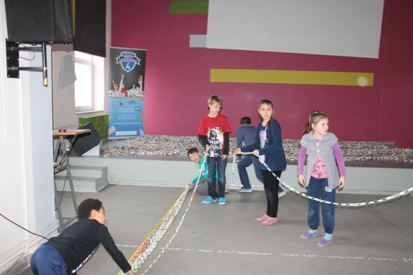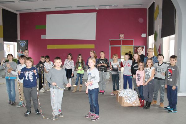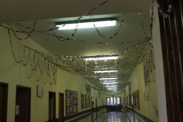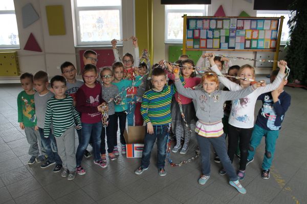 2015.12 happening EKO-ŁAŃCUCH w Szkole Podstawowej nr 4 w Swarzędzu, łańcuch z papieru makulaturowego – happening w duchu ZERO WASTE z wykorzystaniem niepotrzebnych, kolorowych gazet.