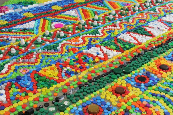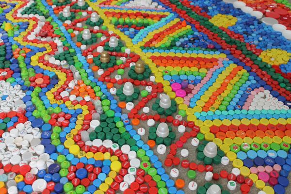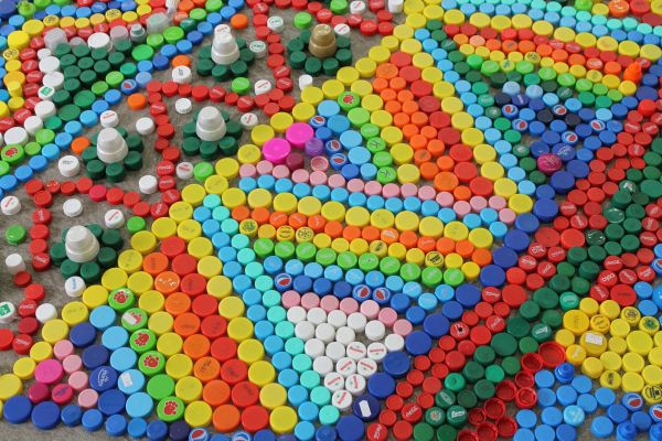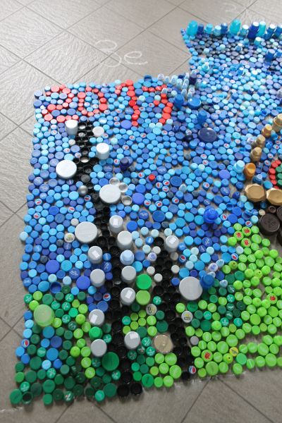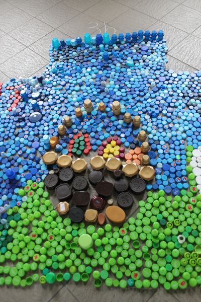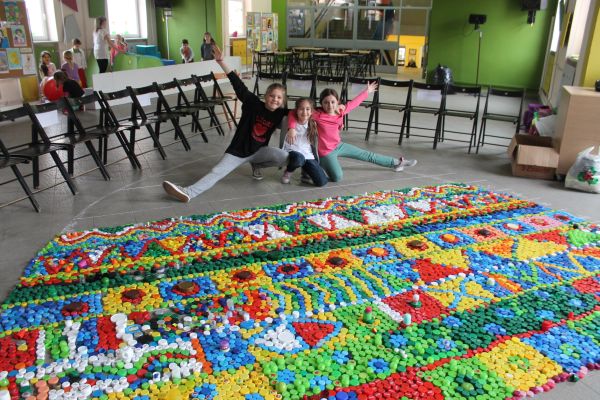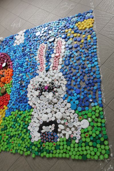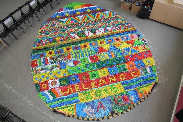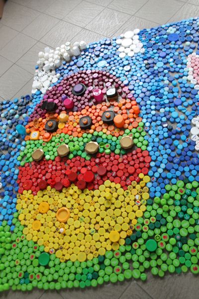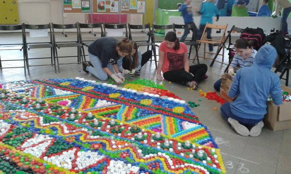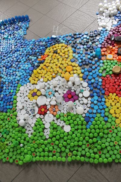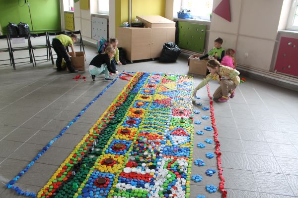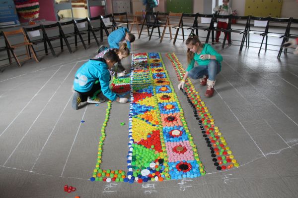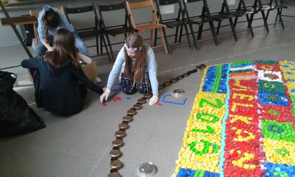 2016.03 happening ZAKRĘCONE JAJO w Szkole Podstawowej nr 4 w Swarzędzu, mozaika z plastikowych nakrętek – działanie artystyczne angażujące uczniów różnych roczników szkoły, pobudzające kreatywność, przy okazji nauka jak efektywnie pracować w grupie a do tego zebraliśmy nakrętki przyłączając się do akcji zbierania tychże dla potrzebujących dzieci z klasy integracyjnej.