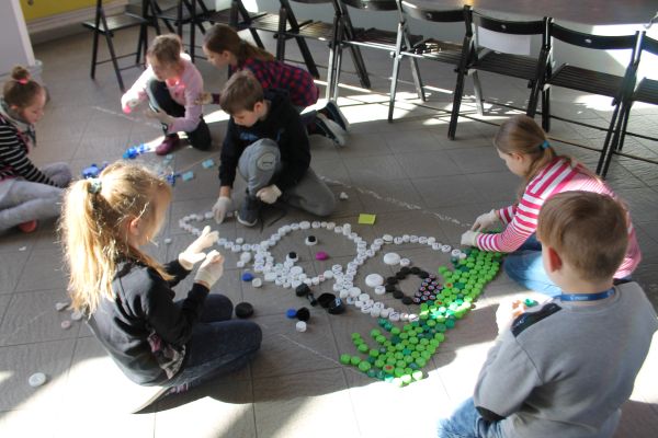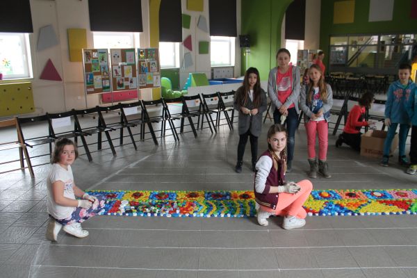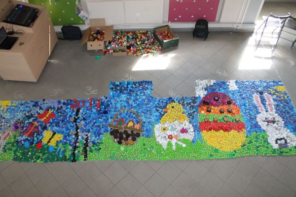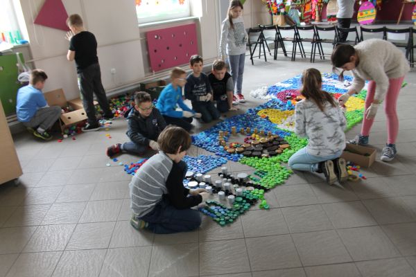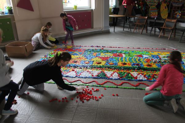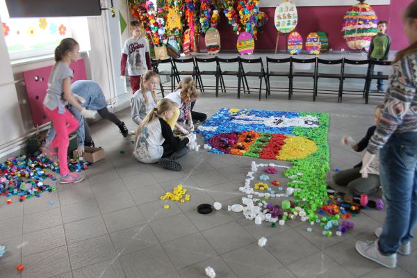 2017.04.10-11 happening MOZAIKA WIELKANOCNA w Szkole Podstawowej nr 4 w Swarzędzu – podobnie jak w roku poprzedzającym – akcja artystyczna pobudzająca kreatywność dzieci, będąca możliwością ćwiczenia efektywnej pracy w zespole, a do tego ponownie charytatywna zbiórka nakrętek dla potrzebujących dzieci.